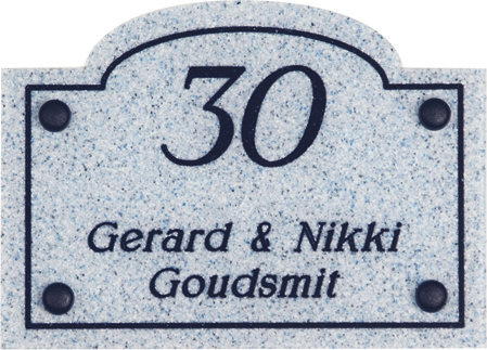 Gravoglas is een luxe en tegelijk stevige kunststofsoort (3 mm dikte), met de uitstraling van gekleurd glas, welke uitstekend geschikt is voor gebruik in en rondom uw woning. De tekst wordt in alle gravoglas-naamborden gegraveerd, waardoor uw naam niet weg kan slijten of vervagen. Het bijzondere aan gravoglas is dat het aan de achterzijde ingegraveerd wordt, dit in tegenstelling tot andere kunststofsoorten. Hierdoor blijft het materiaal aan de voorzijde glad en krijgt het een hele luxe uitstraling. Tot slot: de gravoglas-naamborden zijn standaard voorzien van schroefgaten (tenzij anders vermeld) en worden geleverd met afstandbusjes en afdekdopjes waardoor u het naambord eenvoudig op een korte afstand van de muur kunt monteren. Gravoglas een zeer luxe kunststofsoort dat tegen een stootje kan!